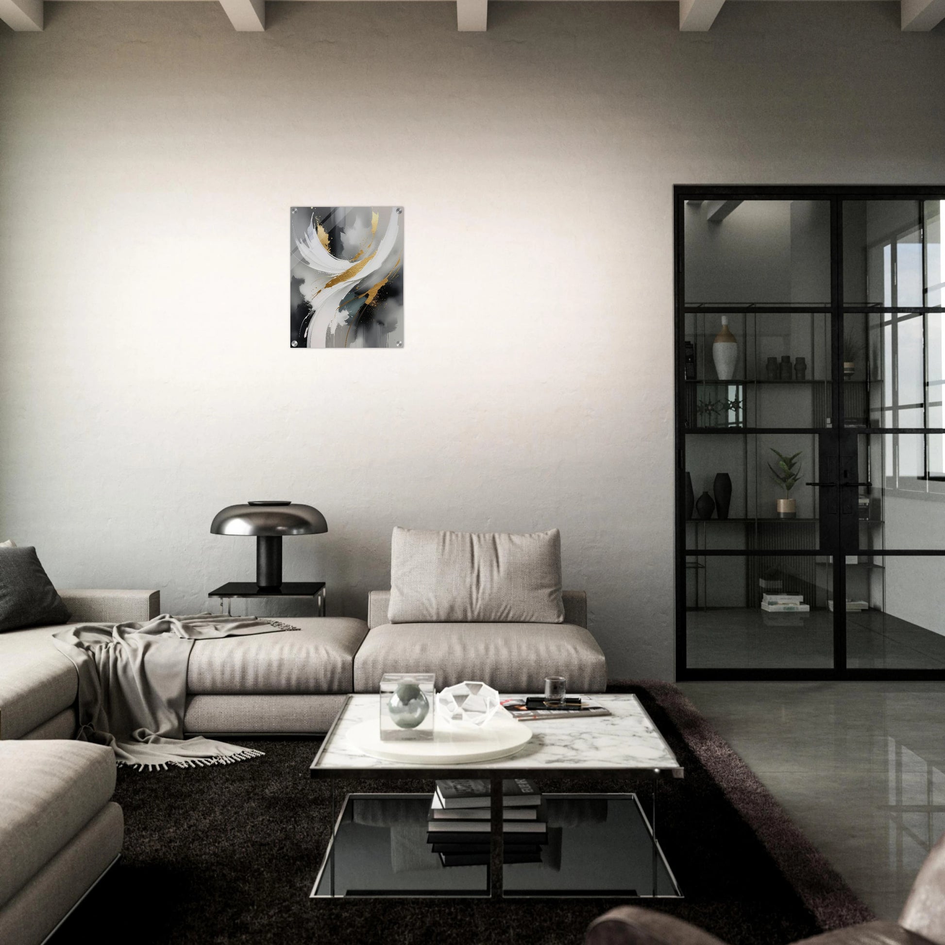 Elevate your space with this captivating abstract acrylic print featuring elegant sweeps of white, gray, and black, beautifully highlighted with shimmering gold accents. This artwork evokes tranquil movement and modern sophistication, reflecting light and energy through dynamic brush strokes and metallic highlights.