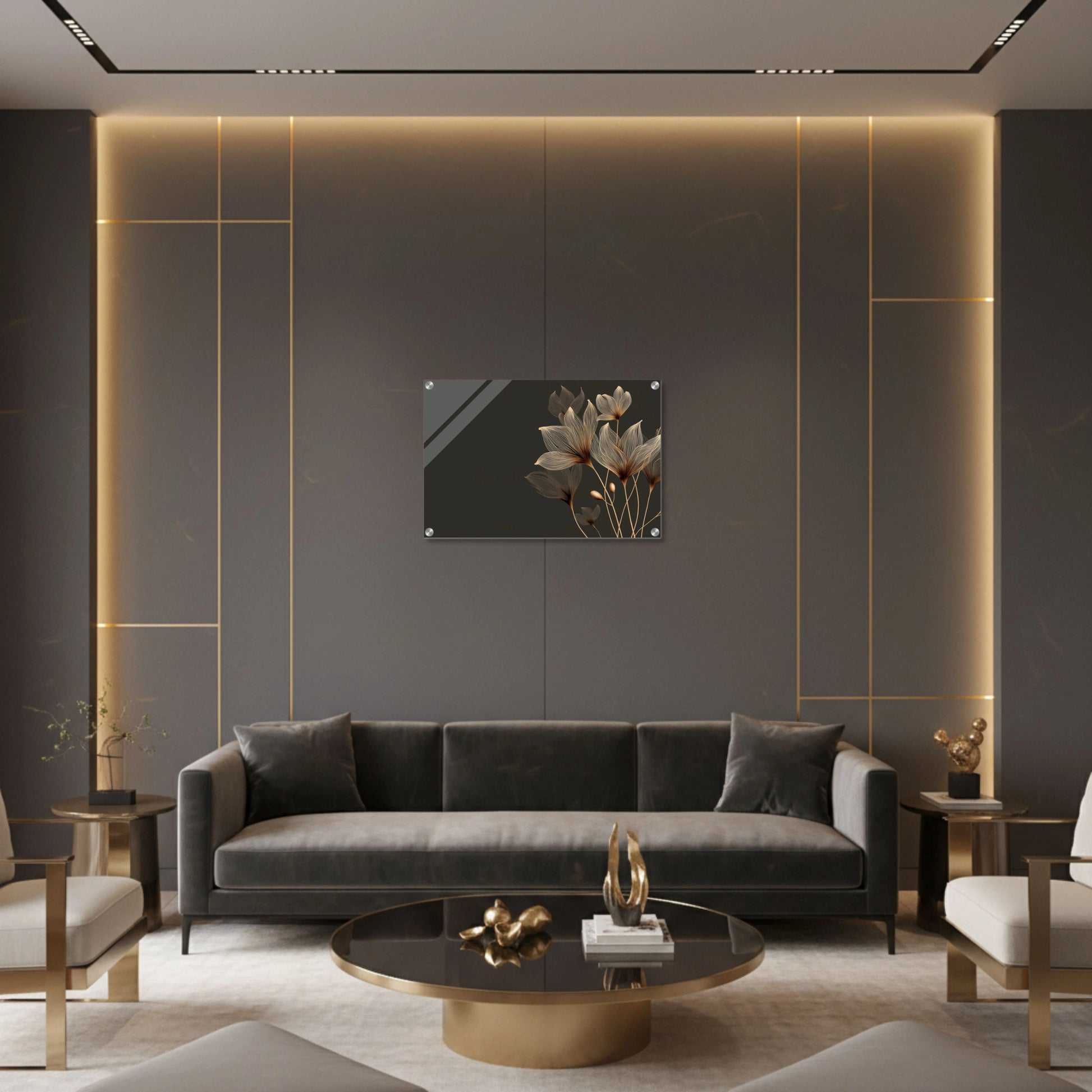 Minimal botanical line wall art featuring soft golden outlines on a dark neutral background creating a refined, luxurious composition.