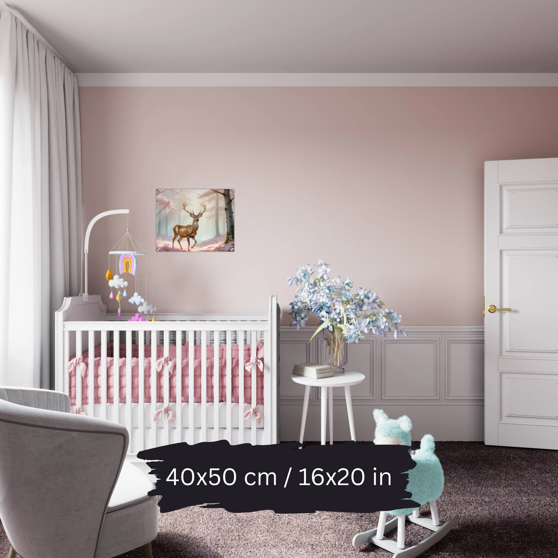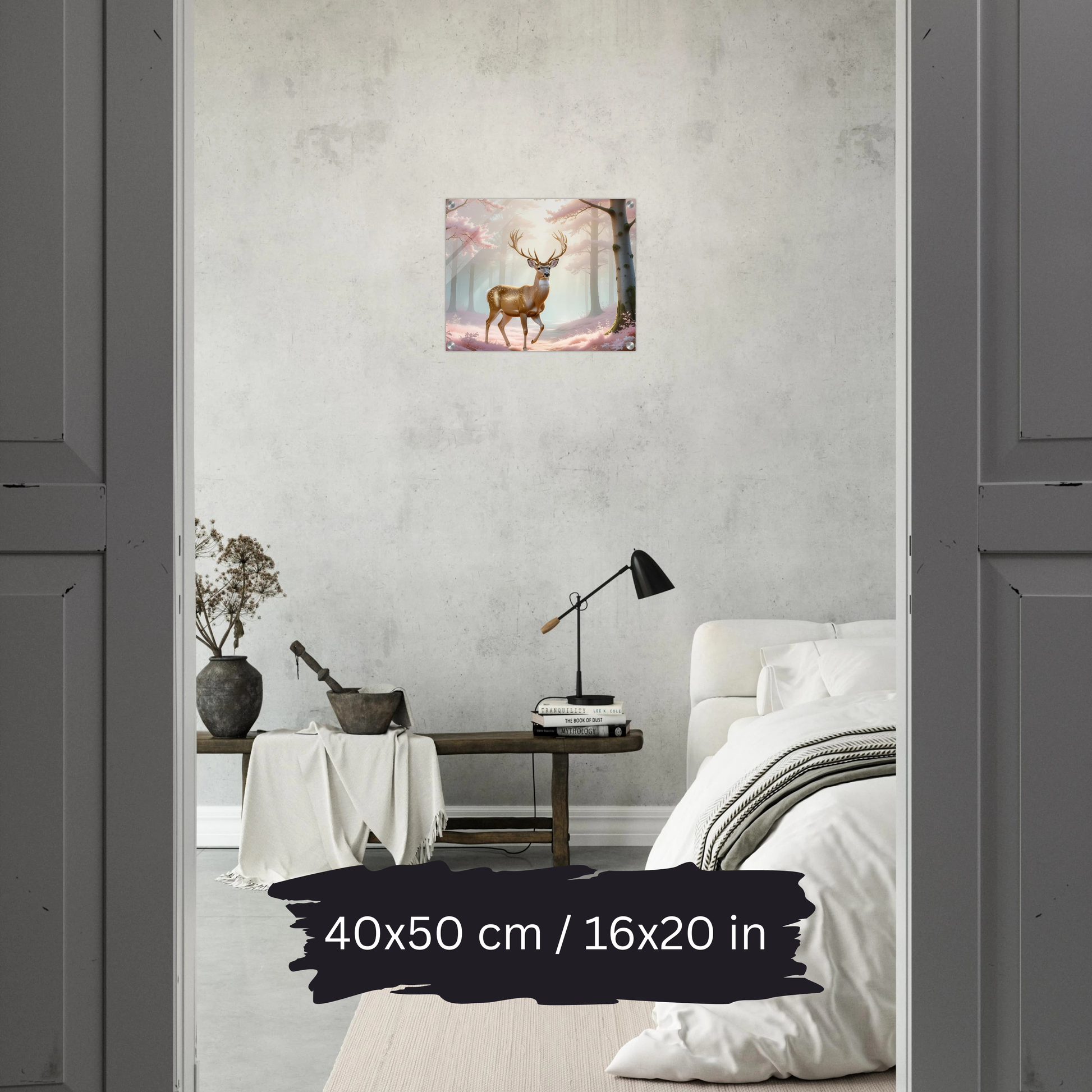 Step into a dreamy forest sanctuary with this enchanting golden deer acrylic print. Bathed in soft pink light filtering through cherry blossom trees, the majestic deer stands proud with luminous golden antlers. This serene piece brings a sense of peace, grace, and natural beauty to any space, creating an atmosphere of tranquility and wonder.